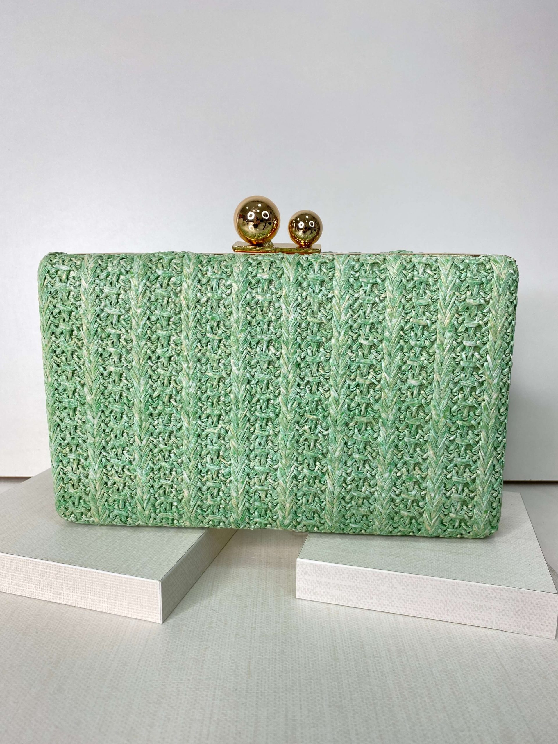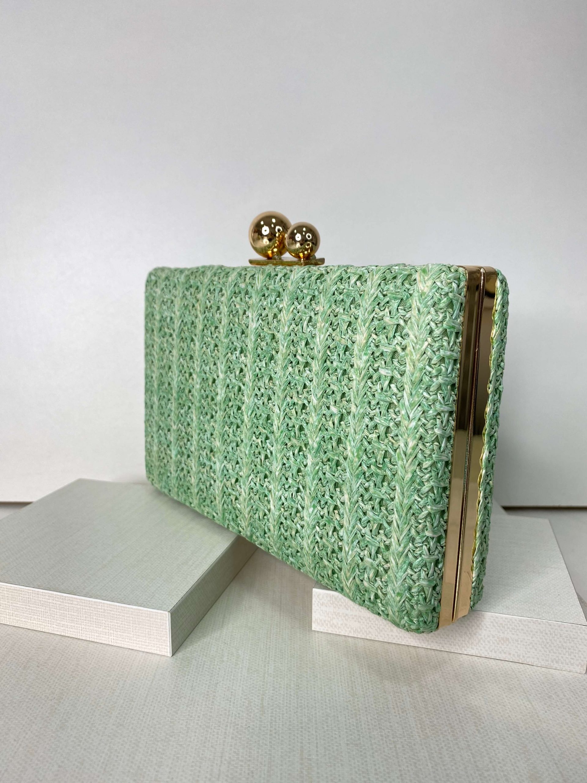 Clutch de festa retangular em palha sintética, fecho em metal dourado. Possui alça longa removível em corrente metal dourado.