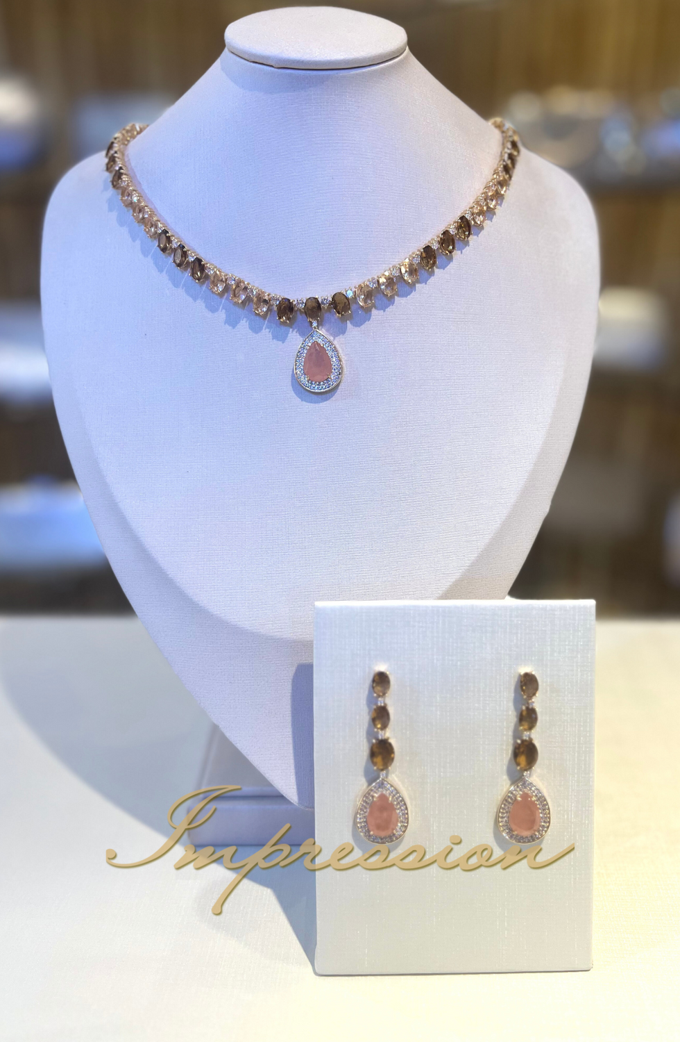 Conjunto de festa em semijoia com pedra rose e pedras em tons de marrom e rose e micro zircônias e strass cristal.