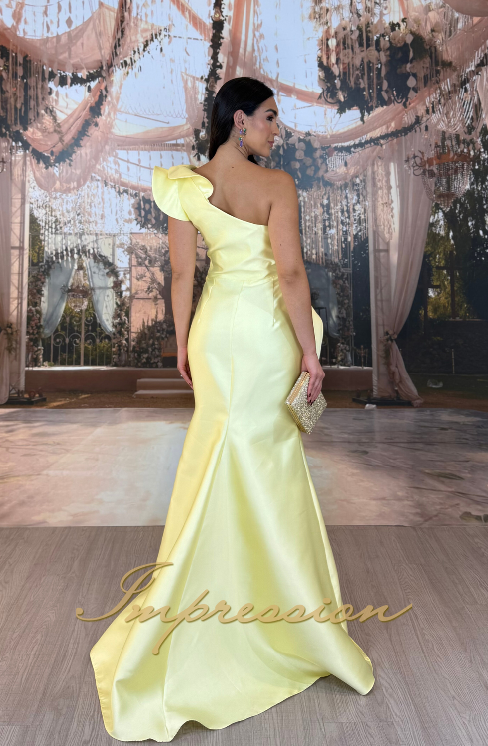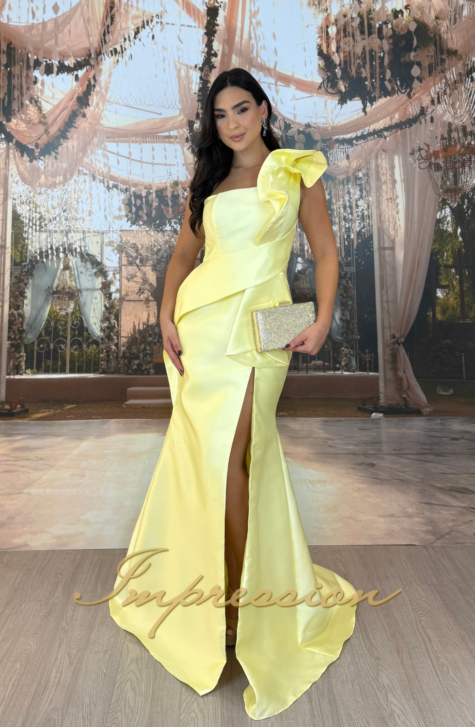 Vestido de festa longo amarelo manteiga em zibeline modelo nula manga com detalhe de babado jabour, shape acinturado, saia com fenda.