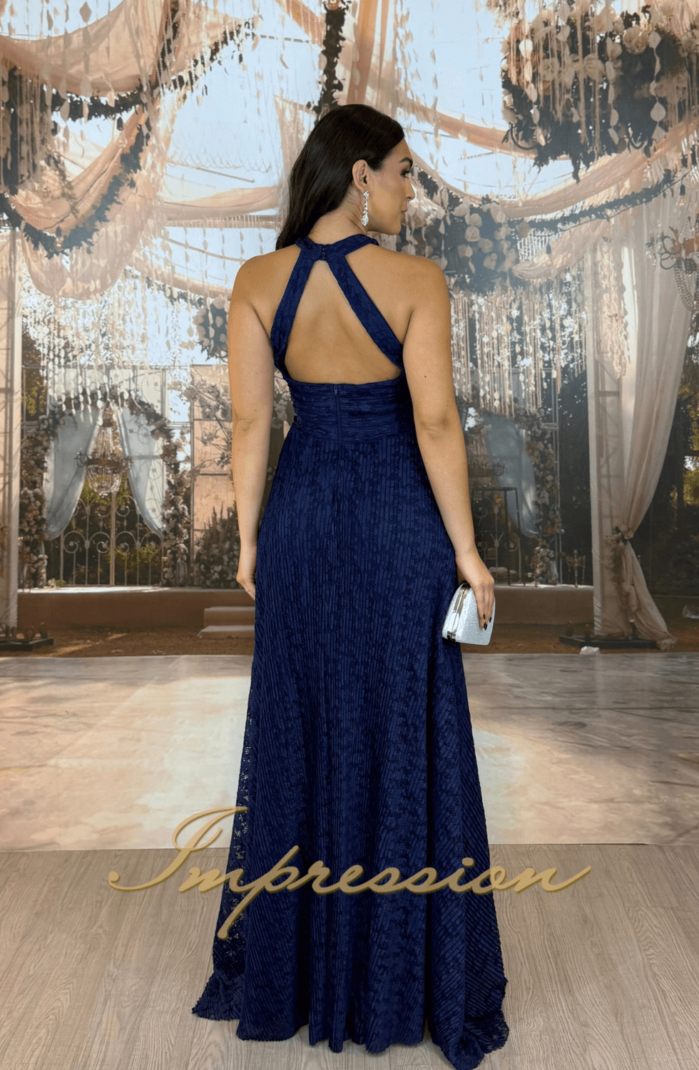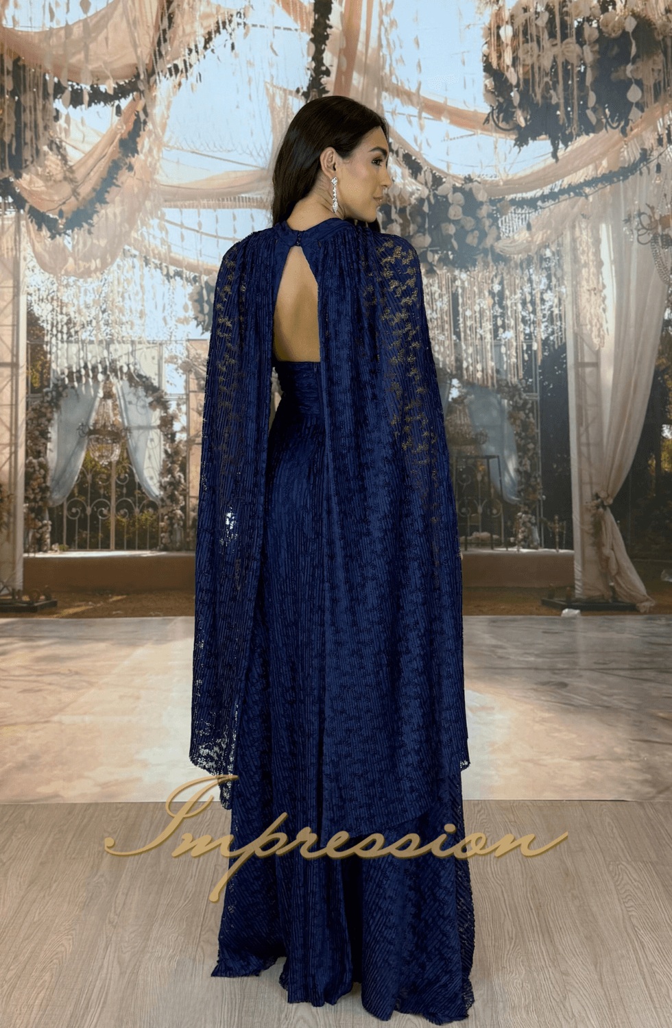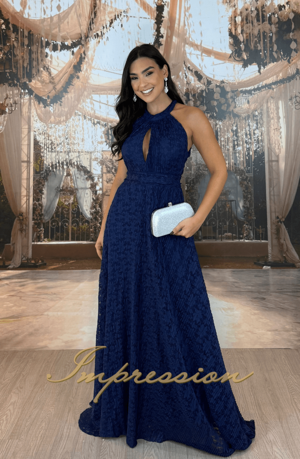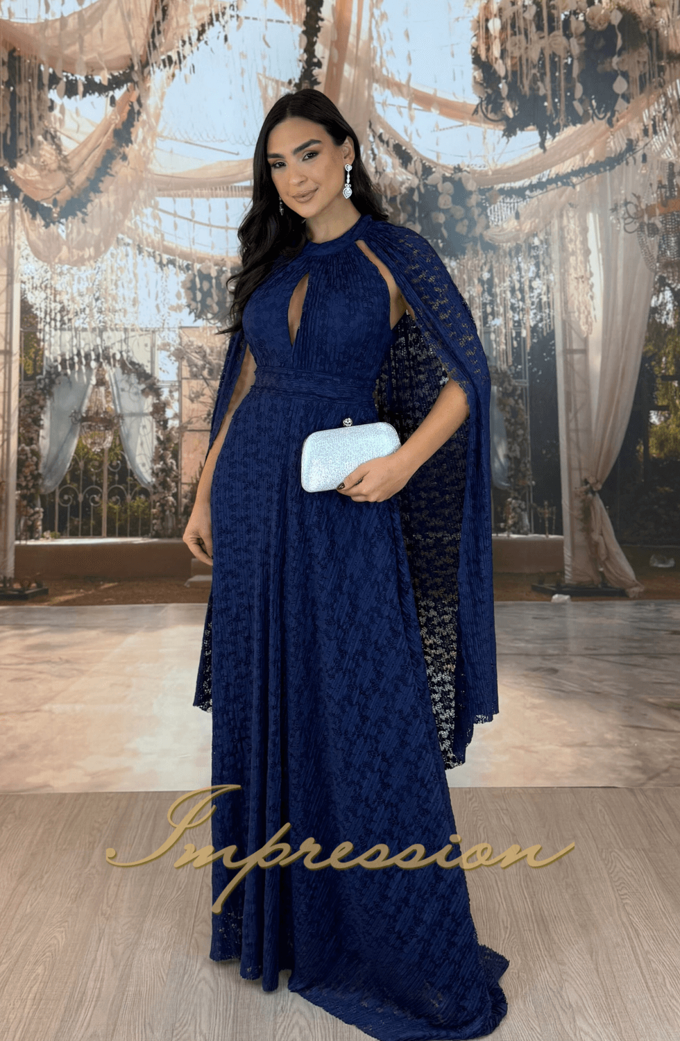 Vestido de festa longo azul marinho em renda, modelo com manga capa removível, decote gota, saia evasê.