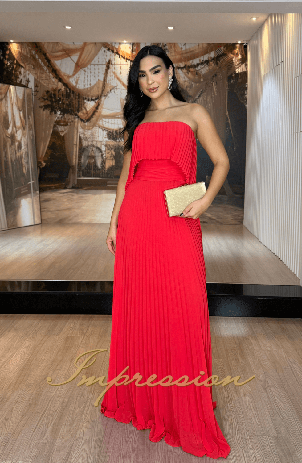 Vestido de festa longo laranja em musseline, modelo tomara que caia com sobreposição plissado, saia evasê plissada.
