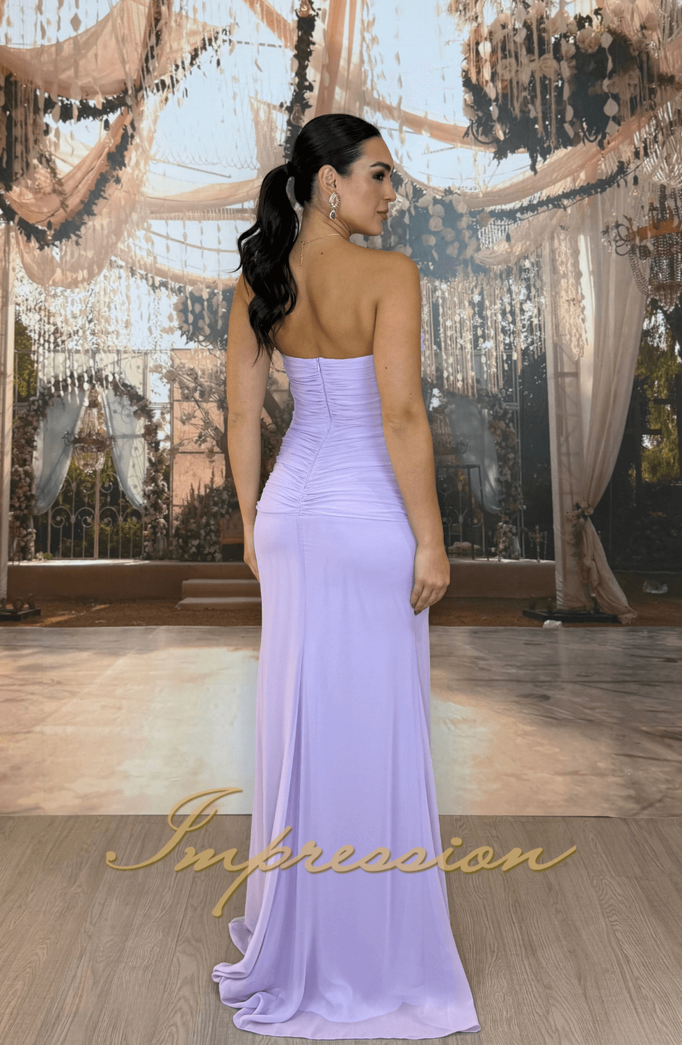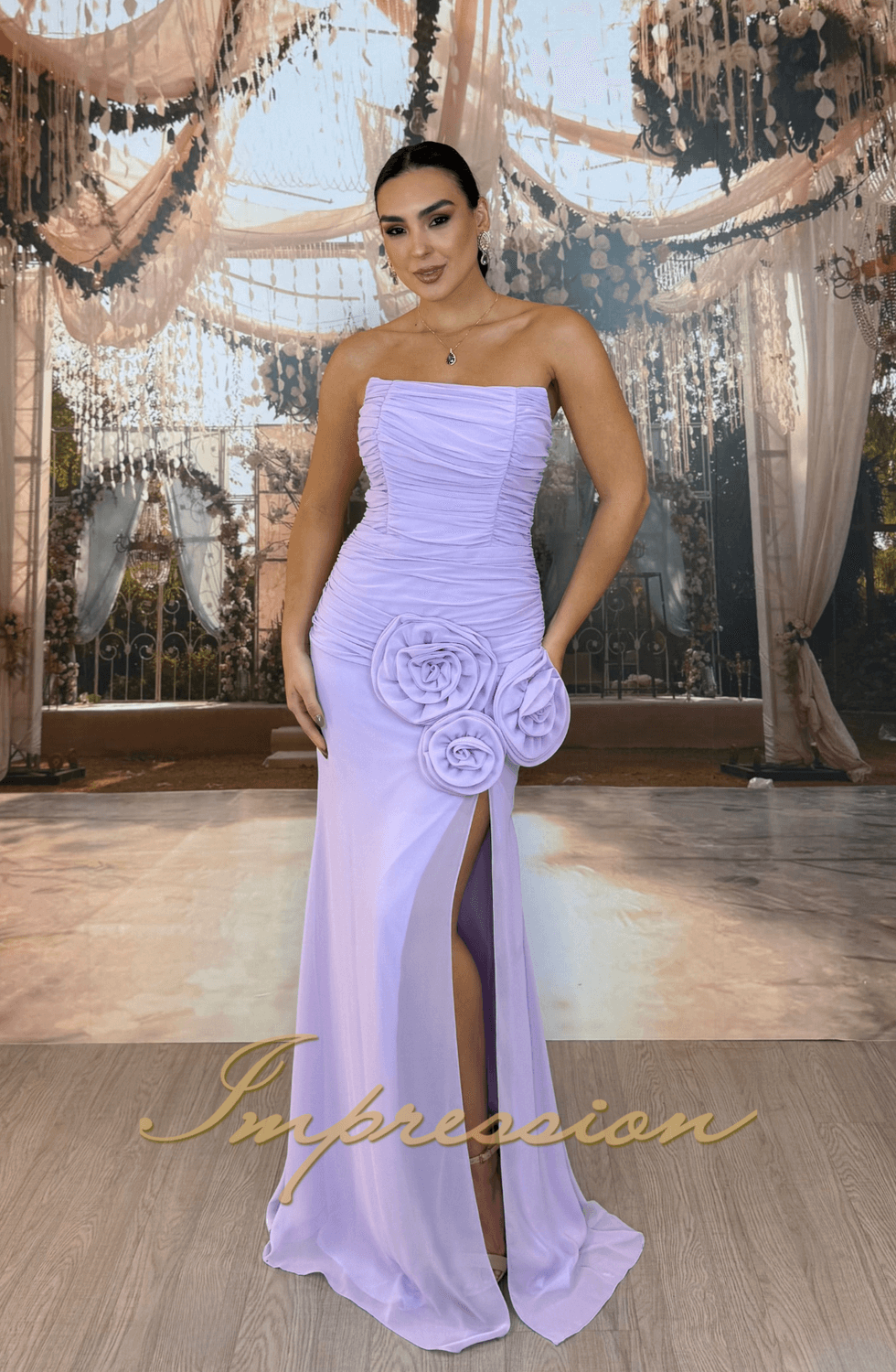 Vestido de festa longo lilás, em musseline, modelo tomara que caia estruturado, drapeado com maxi-flores, saia reta com fenda.
