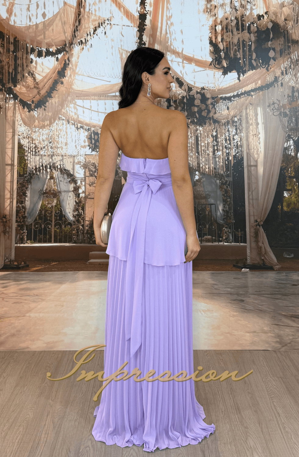 Vestido de festa longo lilás em musseline, modelo tomara que caia com busto plissado, saia com sobreposição e plissado evasê.