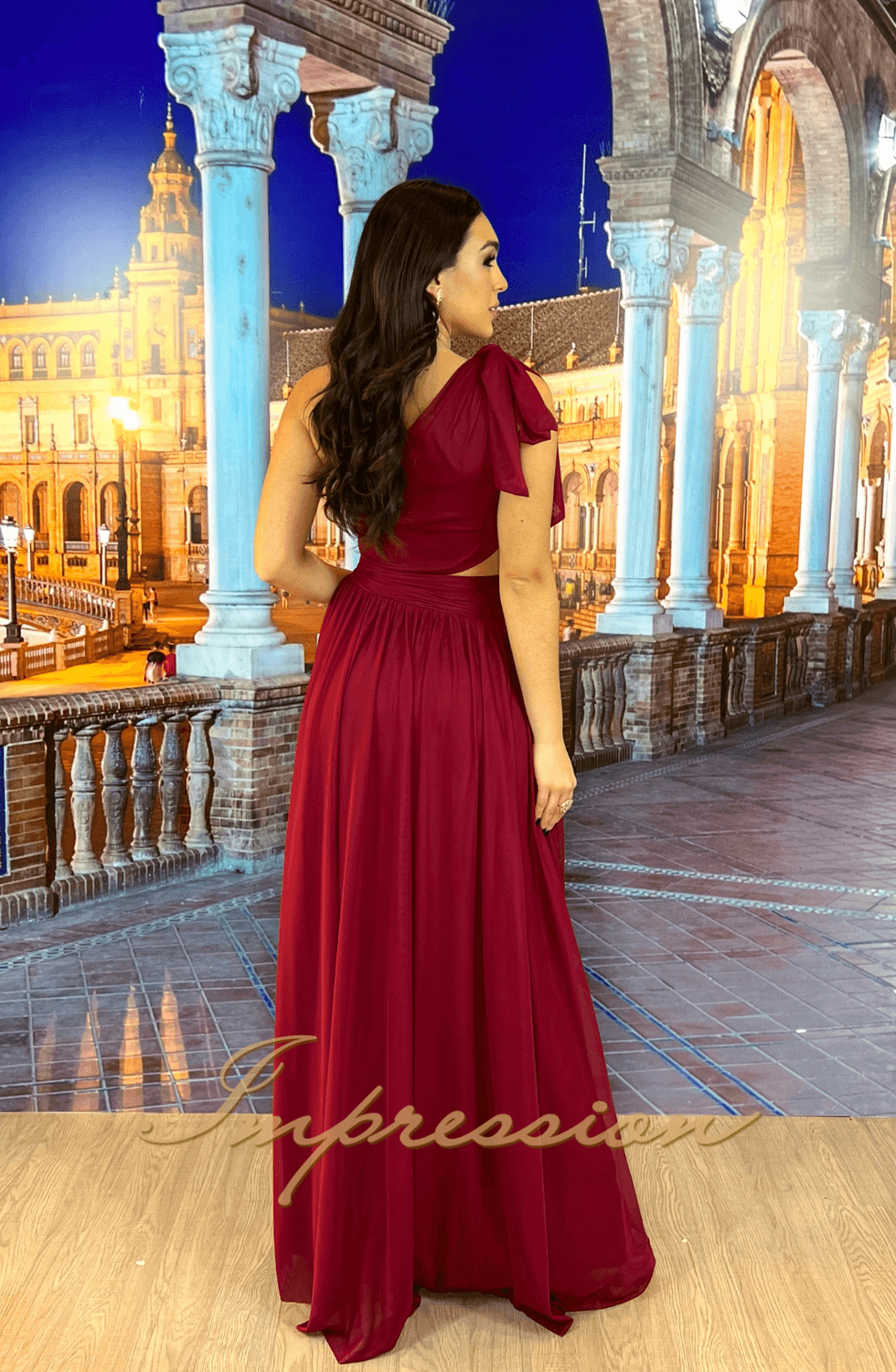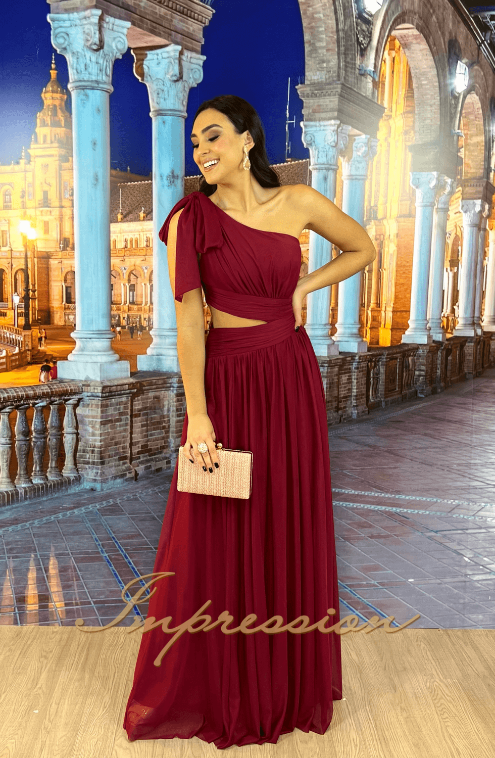 Vestido de festa longo marsala, todo em tulê, modelo um ombro com recorte lateral que acintura e saia com fenda.
