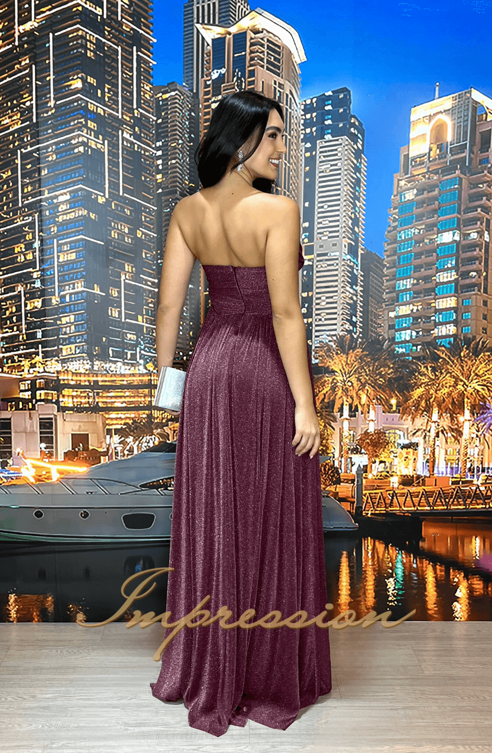 Vestido de festa longo marsala em lurex com brilho sutil, modelo tomara que caia com trançado na cintura e saia evasê.