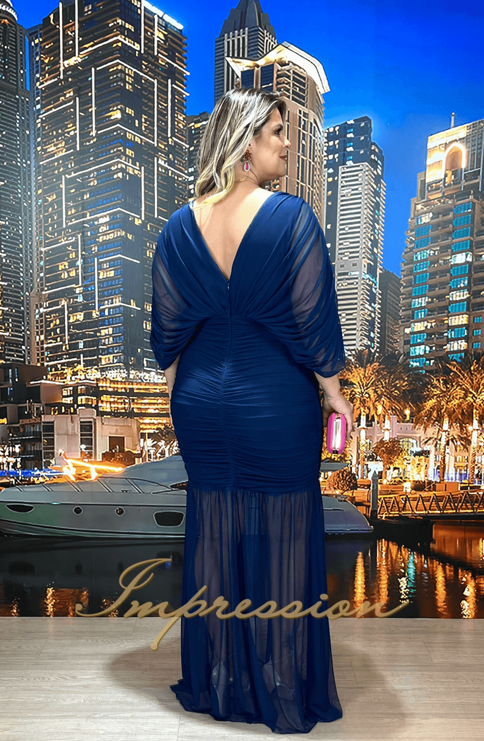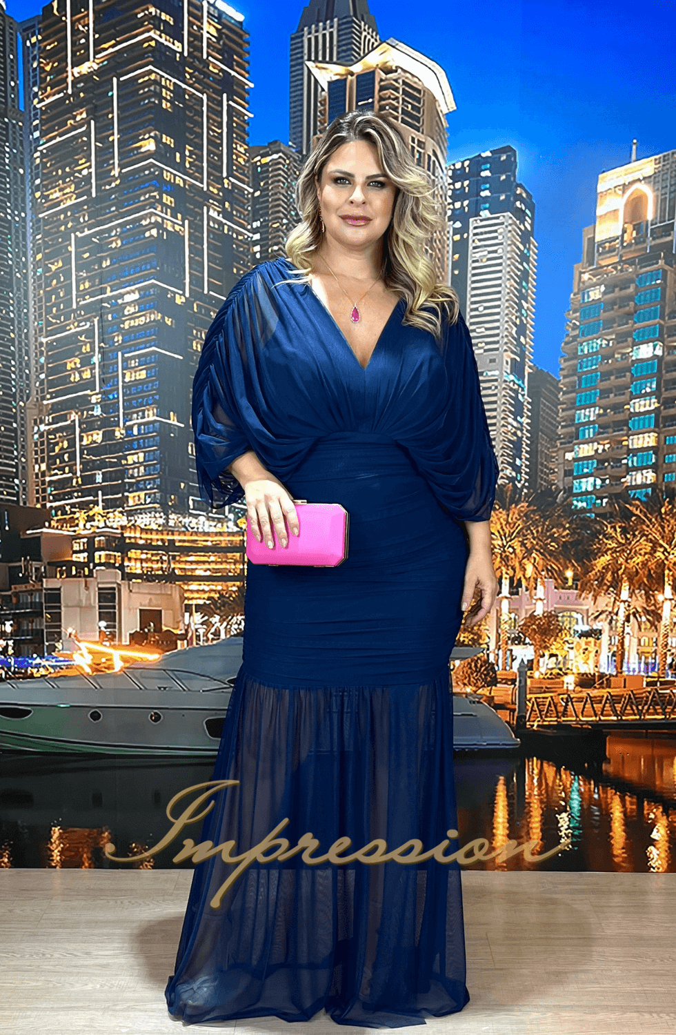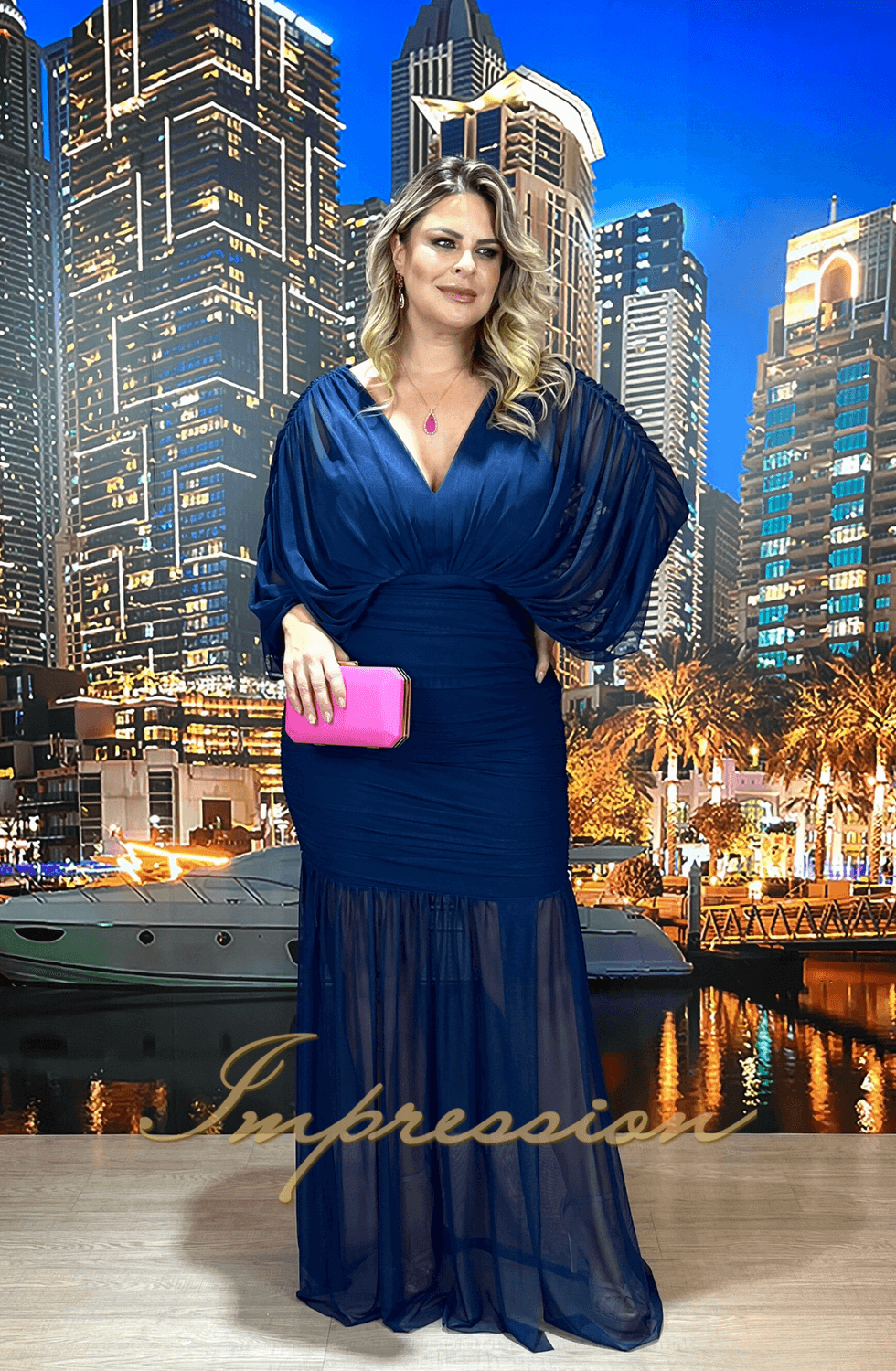 Vestido de festa longo plus size azul marinho todo em tule, com manga ampla drapeada, saia drapeada e detalhe com transparência.
