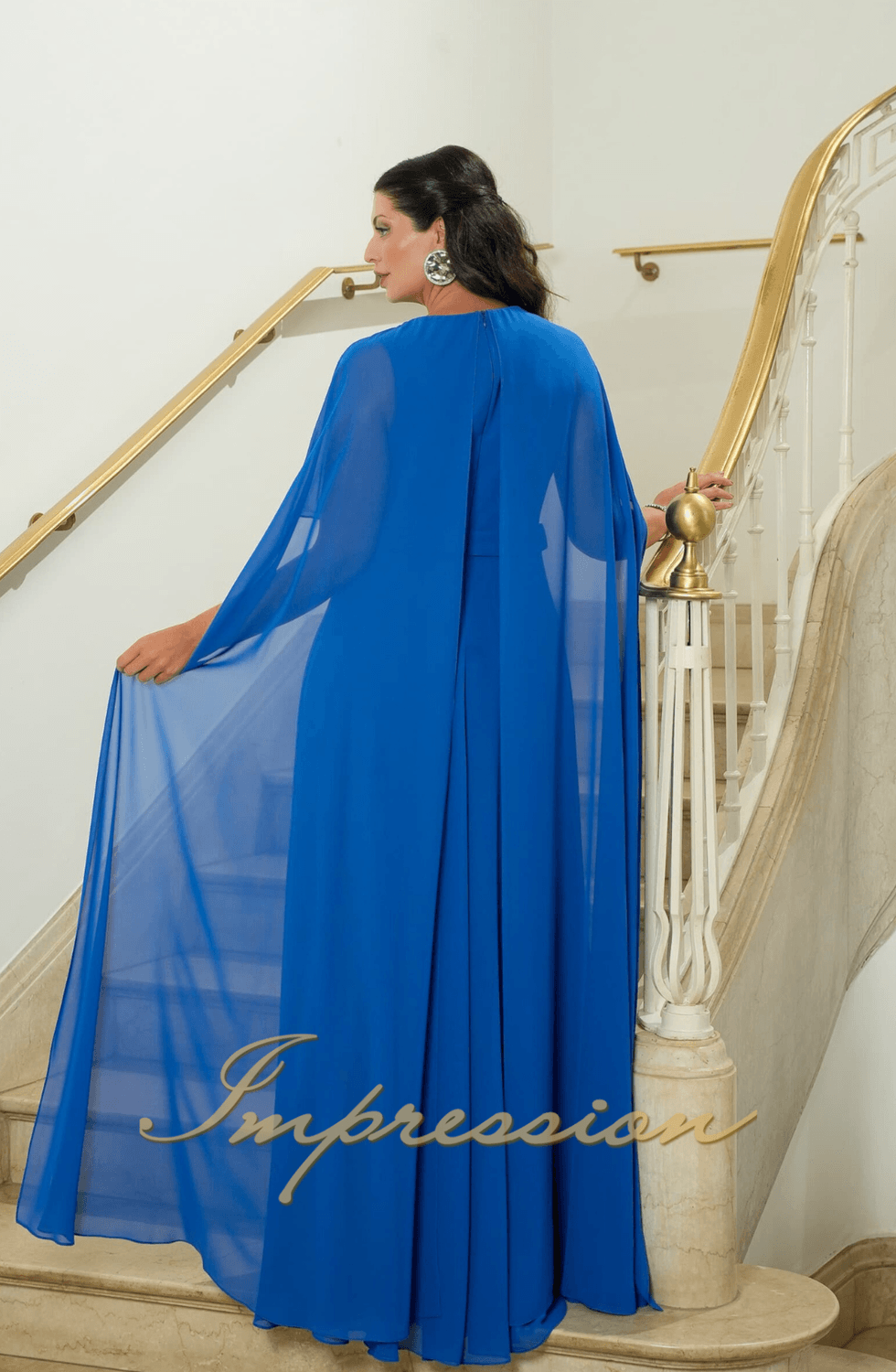 Vestido de festa longo plus size orquidea em musseline, modelo com manga capa com detalhe em flores e decote com tule ilusione.