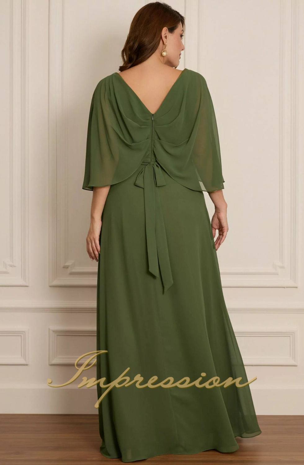 Vestido de festa longo plus size verde oliva em musseline modelo com decote em v, manga capa e saia evasê.
