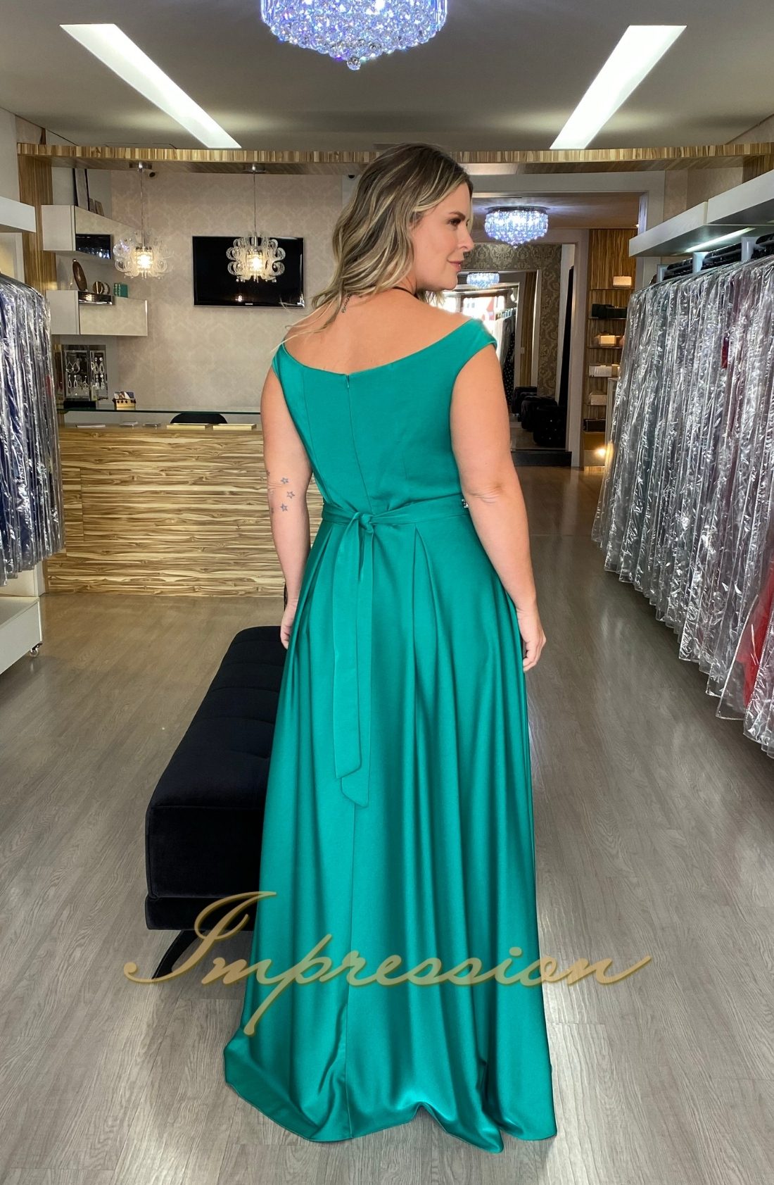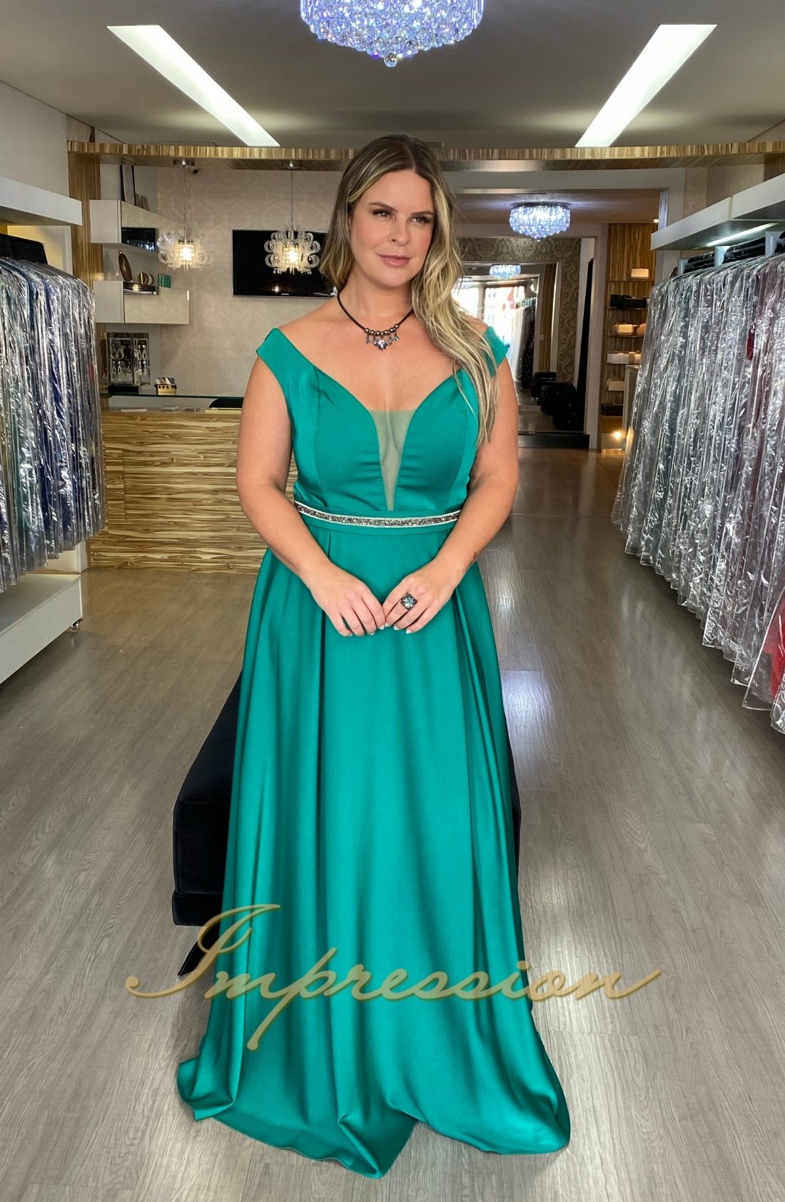 Vestido de festa longo plus size verde, decote ombro a ombro, saia pregas.