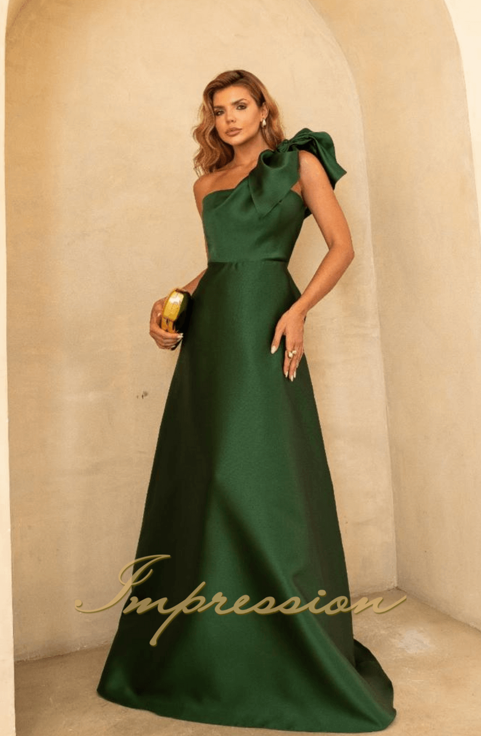 Vestido de festa longo verde oliva em zibeline, modelo nula manga com detalhe de flor no ombro, saia evasê com bolso.