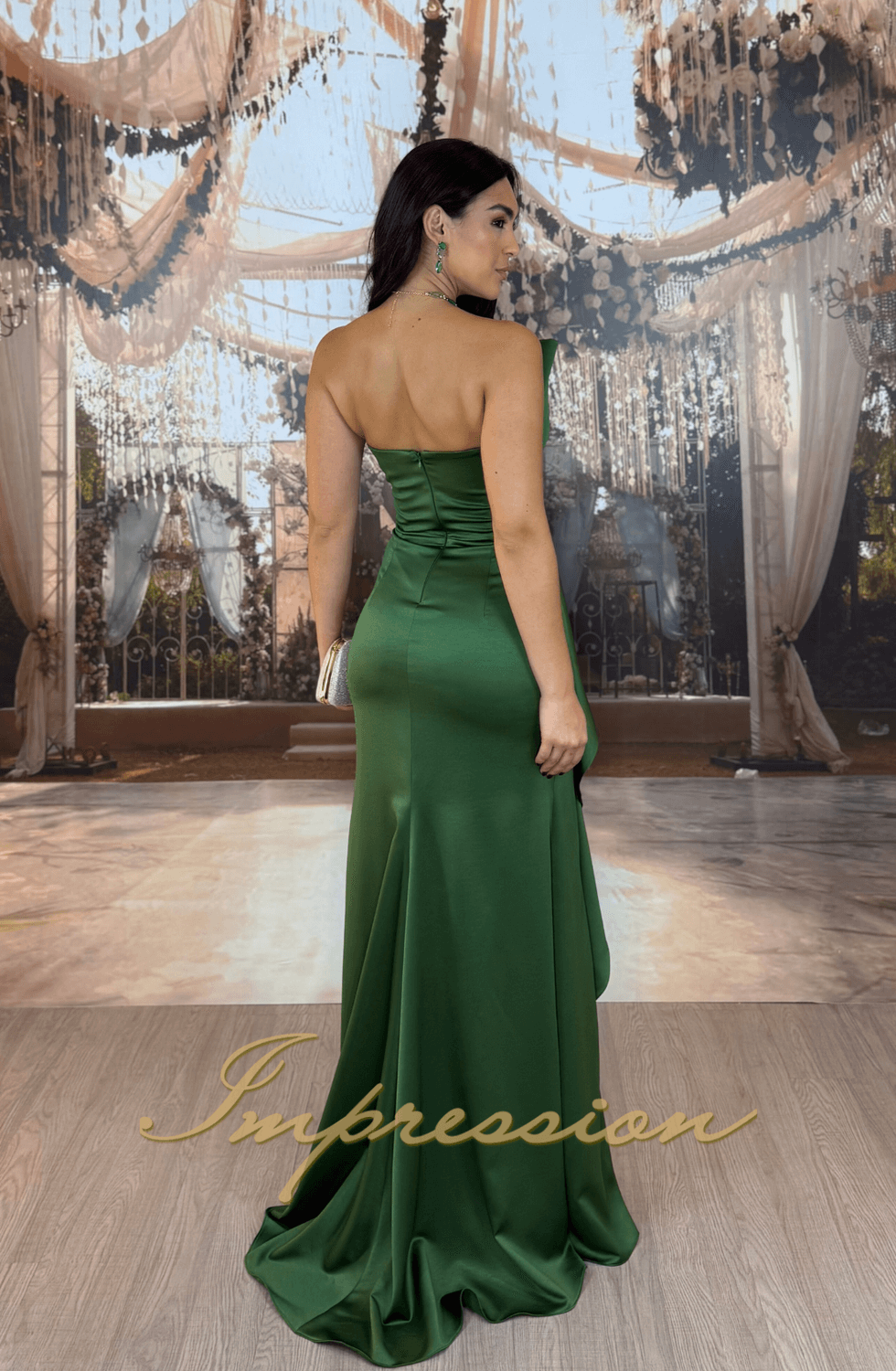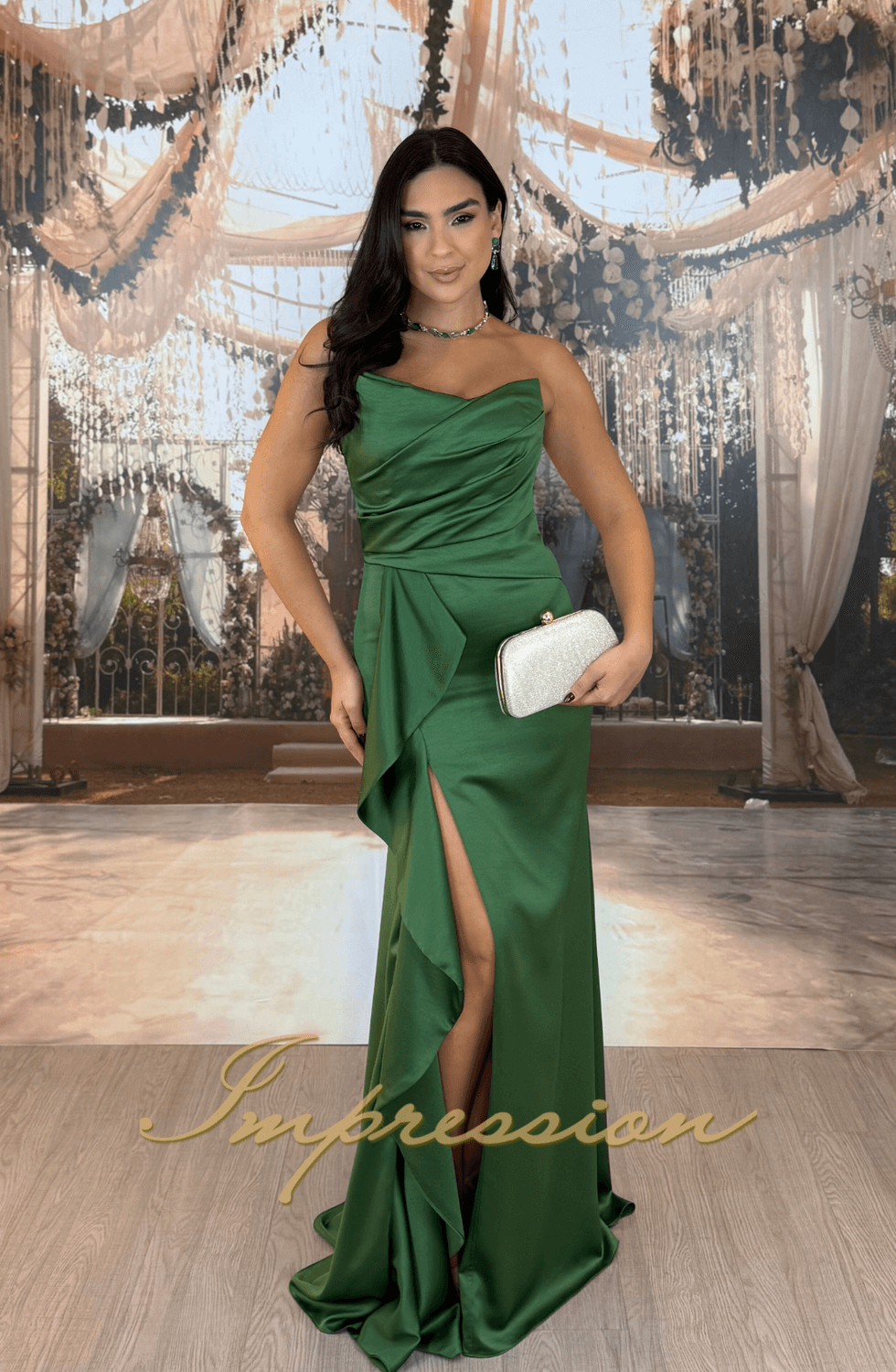Vestido de festa longo verde oliva crepe acetinado, modelo tomara que caia estruturado, saia com babado e fenda.