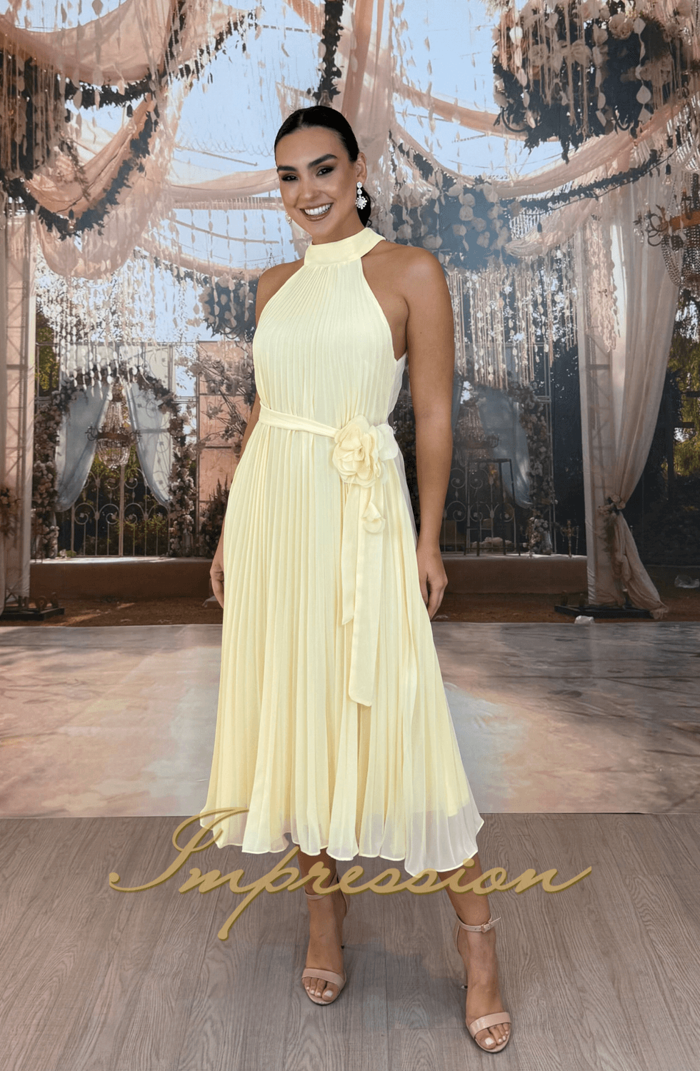 Vestido de festa amarelo midi em musseline, modelo trapézio plissado, acompanha broche de flor e faixa opcional que ajusta e modelo a silhueta, saia leva e fluida.
