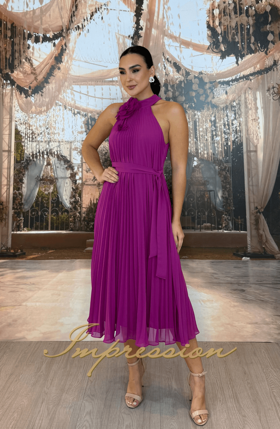 Vestido de festa fucsia midi midi em musseline, modelo trapézio plissado, acompanha broche de flor e faixa opcional que ajusta e modelo a silhueta, saia leva e fluida.